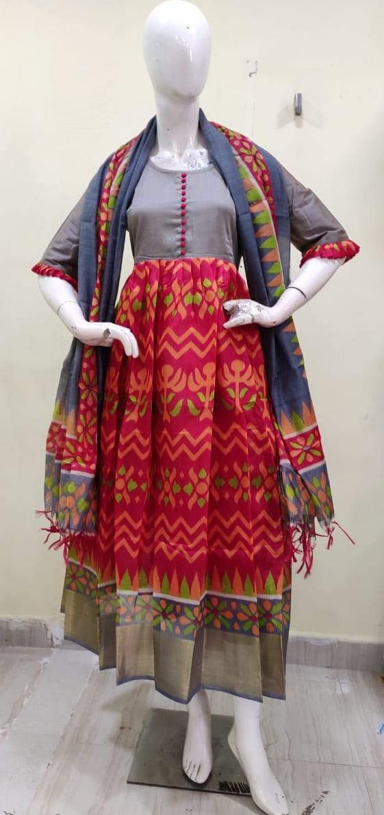 PINK AND GREY COLOR IKAT HANDLOOM SILK COTTON KURTI WITH DUPATTA FOR WOMEN -KFISK001PG