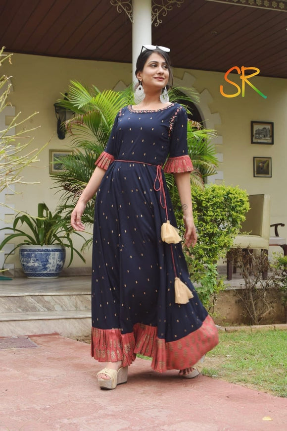 Premium Rayon Full Flare Kali Pattern Gown with Khadi Print Overall and block Print with Gota Detailing-RESHCKW001B