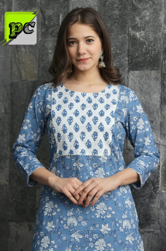 JANVI, STYLISH BLUE COTTON KURTI AND PANTS FOR WOMEN -MAWCKW001