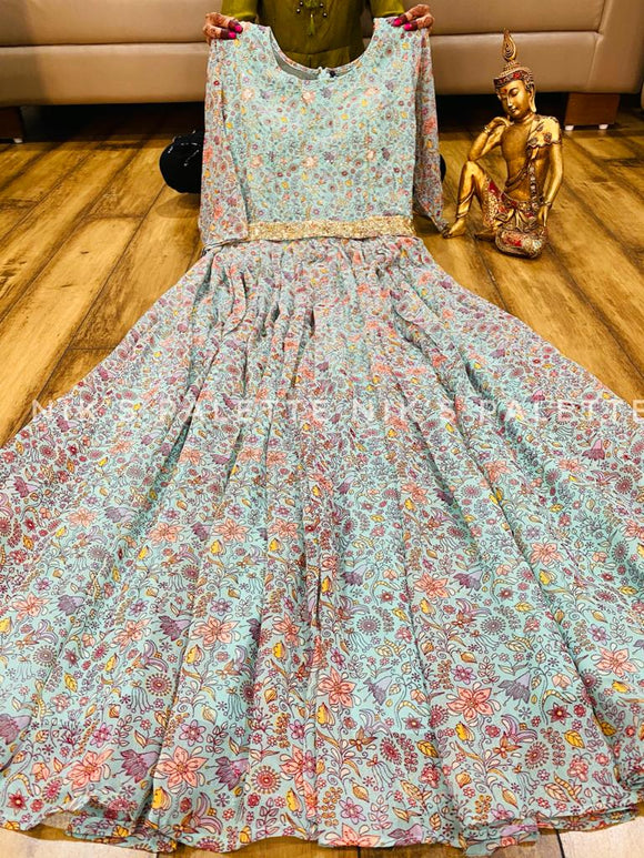 Premium Georgette Fabric printed full flair Jumpsuit with Aari & sequins work on yoke paired with heavy work waist-belt-BEGUMJC001