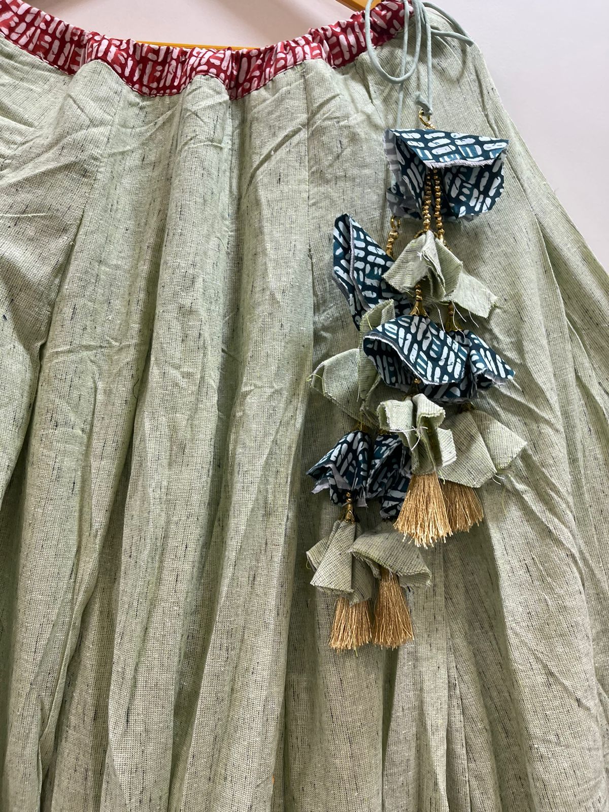 Skirt/bottom: Slub Cotton Cotton Heavy embroidery & Mirror work lehenga with Classic superb matching contrast border which gives perfect look to lehenga