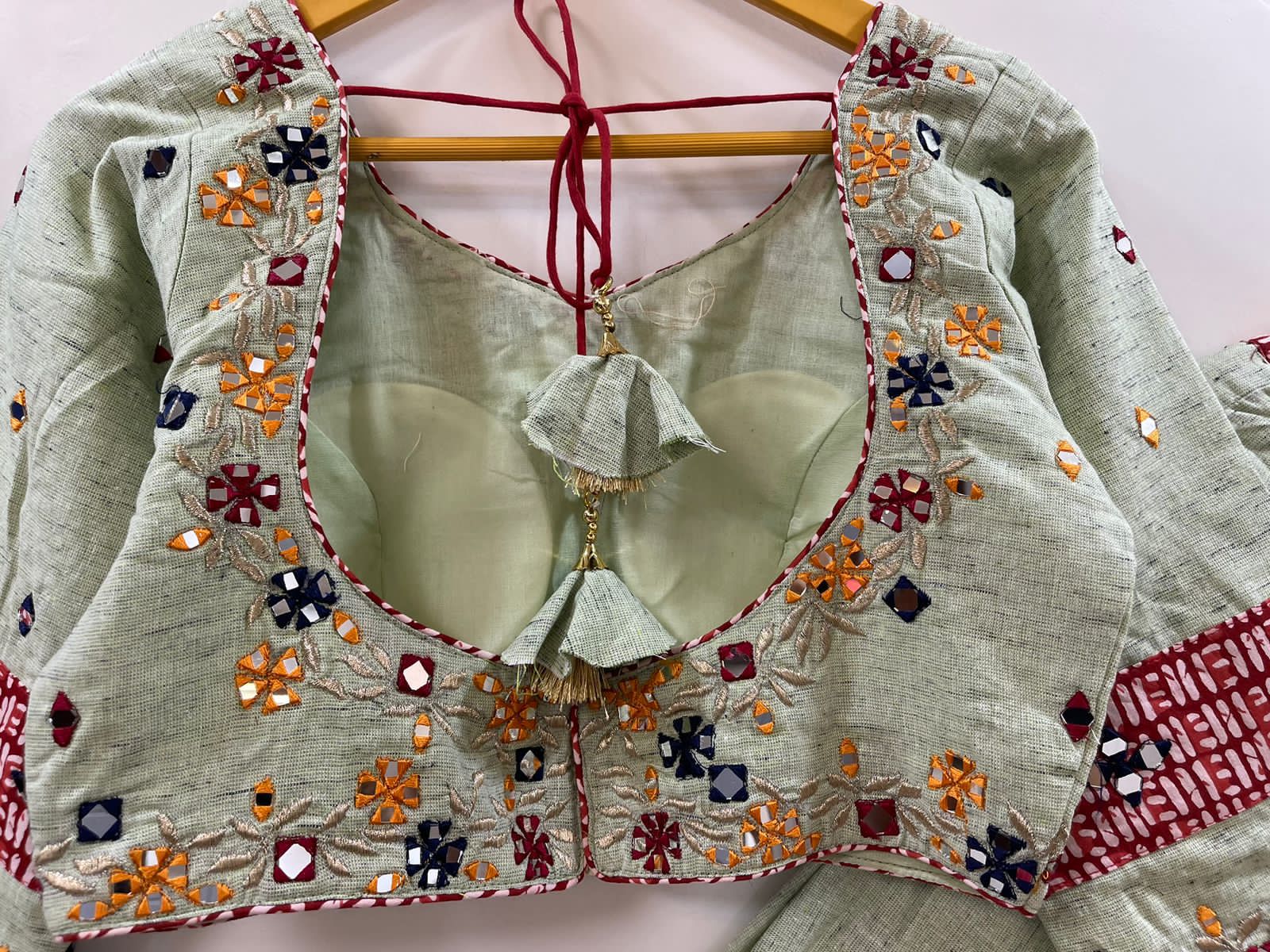 Blouse: Slub Cotton Mirror work blouse with heavy embroidery full sleeve Readymade 38” plus margin