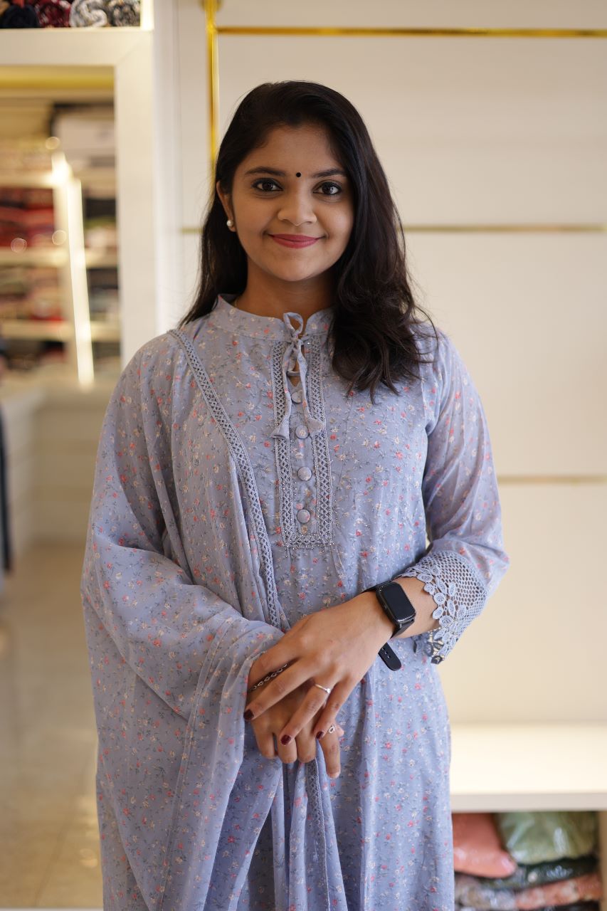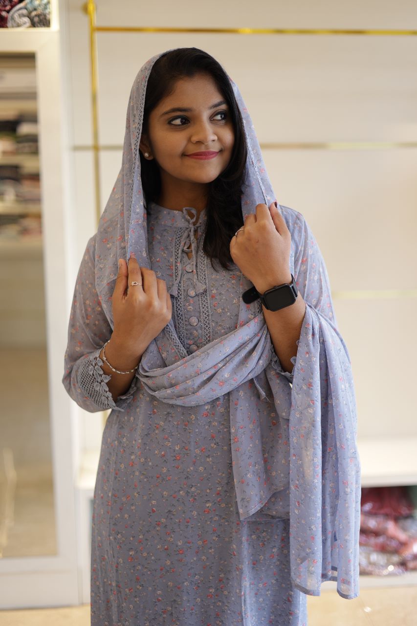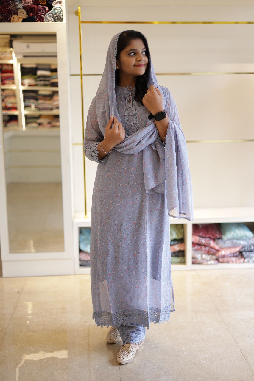 Grey Floral New Georgette Salwar Suit Set with Lace Borders - SAHE001GSS