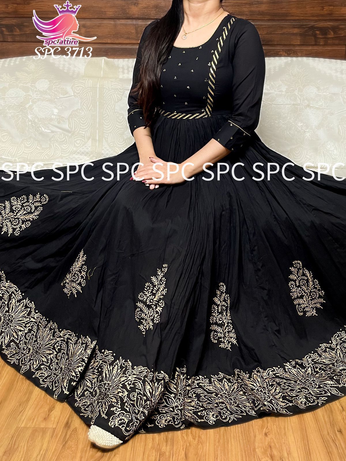 Premium mul cotton  tier pattern block print foil  full flair(12 meter) gown..with beautiful yoke  bijiya sequins  detailing-GARI001BLK