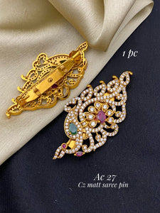 Elegant matt gold finish saree Pin with white stones for women