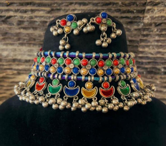 Enhance your appearance with our Classic Gungroo Beauty, a 3 Layered Oxidised Silver Finish Necklace Set for women . This set includes an adjustable necklace adorned with ghoonghru beads and a coordinating stud, adding a touch of elegance to any outfit.