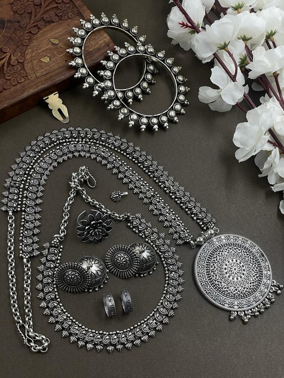 Mrig nayani , Oxidised Silver Finish Double Necklace Full combo set -SANDY001DNB