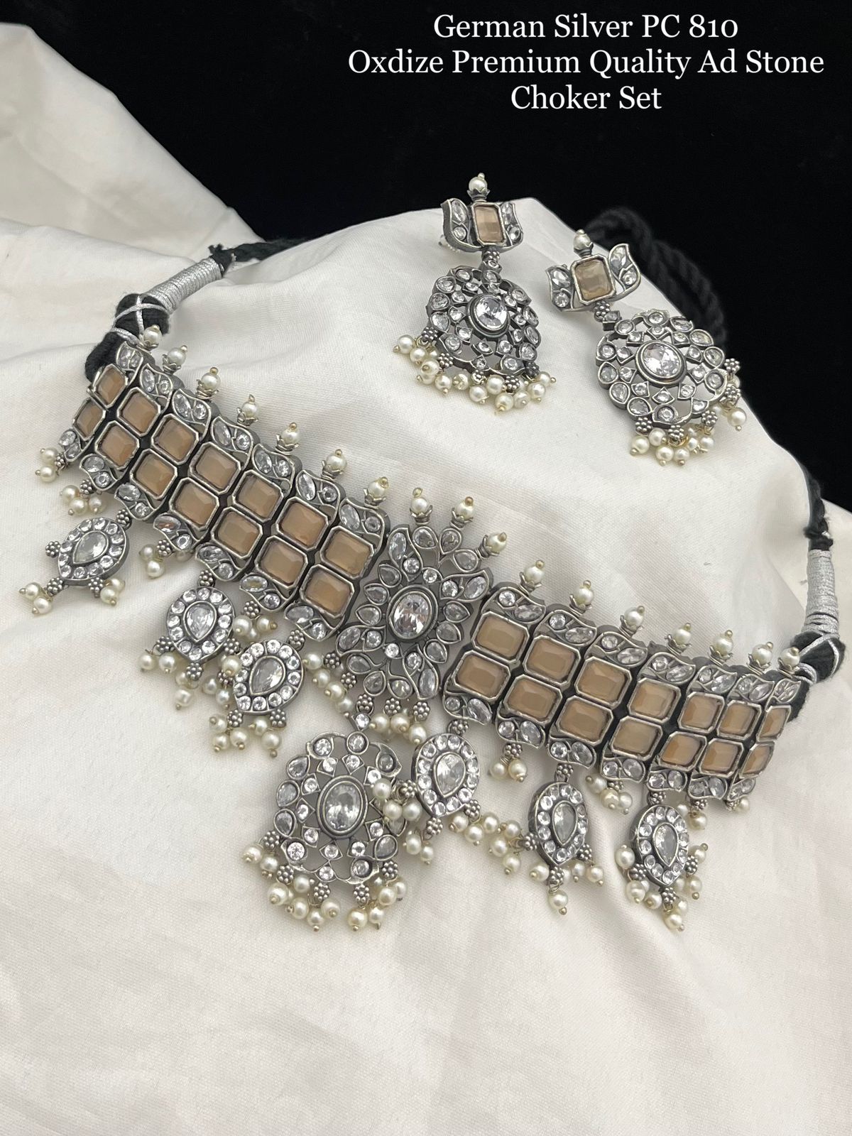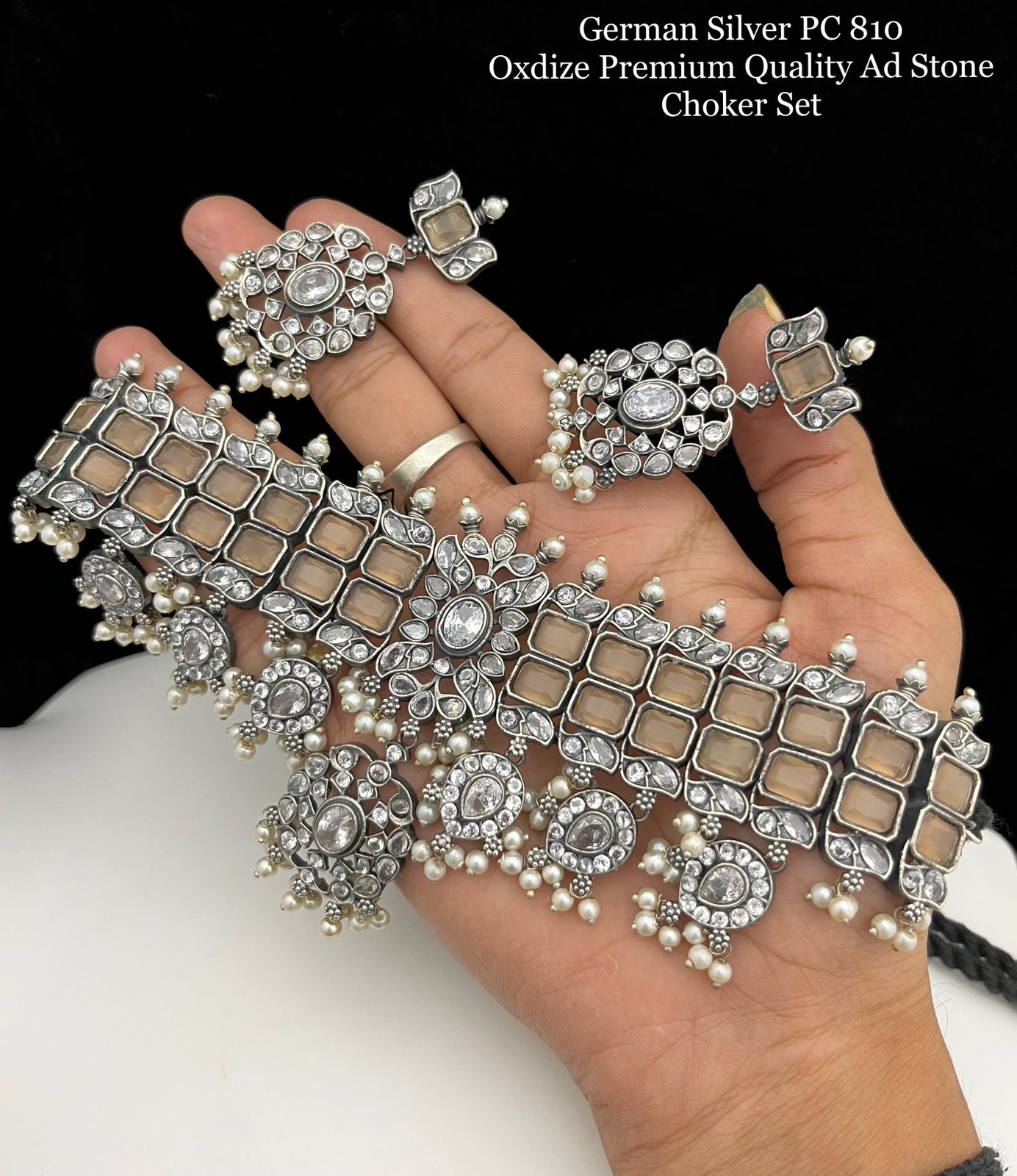 Elegant German Silver Oxidised Finish Premium Quality American Diamond Choker Set for Women