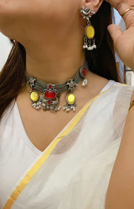 Sonali, Red Shade Oxidised silver High quality choker with earrings -MUSKAN001RC