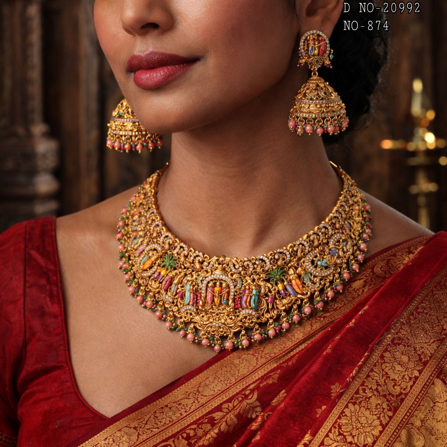 Embrace timeless elegance with this exquisite South Indian Temple Jewelry inspired Necklace Set. Crafted with an Antique Gold finish and intricate Minakari detailing, the Sudharshana collection captures the essence of traditional Temple Jewelry. This stunning set features vibrant enamel work and ornate design elements that reflect authentic craftsmanship. Perfect for festive occasions, weddings, or adding a touch of cultural sophistication to your everyday style. Each piece celebrates the artistry of South Indian jewelry traditions, making it an ideal choice for women who appreciate heritage and refined beauty.