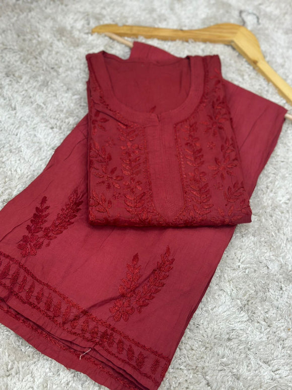 A kurti and palazzo set, a traditional Indian outfit with intricate Lucknowi embroidery on a cotton fabric.. The top has a comfortable fit, with a round neckline and long sleeves, paired with a matching palazzo, which is a loose and flowy pant with a wide leg. Tone to tone embroidery makes it perfect for both casual and formal occasions and elegant at the same time and adds a touch of traditional elegance to the outfit, making it stand out from other regular cotton outfits.