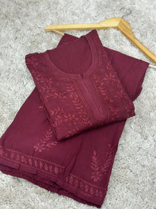 A kurti and palazzo set, a traditional Indian outfit with intricate Lucknowi embroidery on a cotton fabric.. The top has a comfortable fit, with a round neckline and long sleeves, paired with a matching palazzo, which is a loose and flowy pant with a wide leg. Tone to tone embroidery makes it perfect for both casual and formal occasions and elegant at the same time and adds a touch of traditional elegance to the outfit, making it stand out from other regular cotton outfits.
