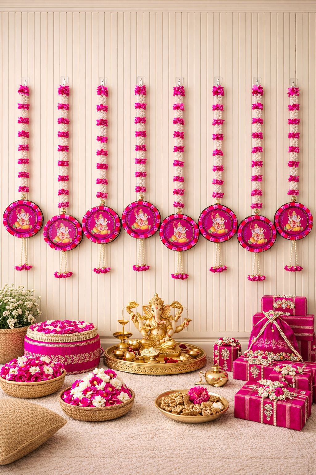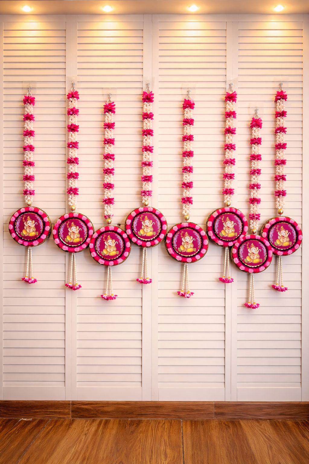 Featuring detailed Ganesha medallions with gajra-style floral strings, it adds an auspicious and vibrant charm to your mandir, entrance, or festive backdrop.