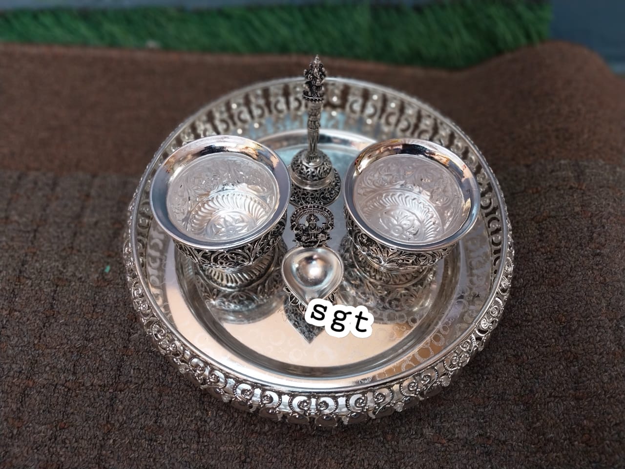 Full set impressive imported German silver washable tray with antique German silver washable special Nakashi work done Kum Kum Pasupu bowls with special Nakashi work , Bell and Gajalakshmi Diya pure silver coated