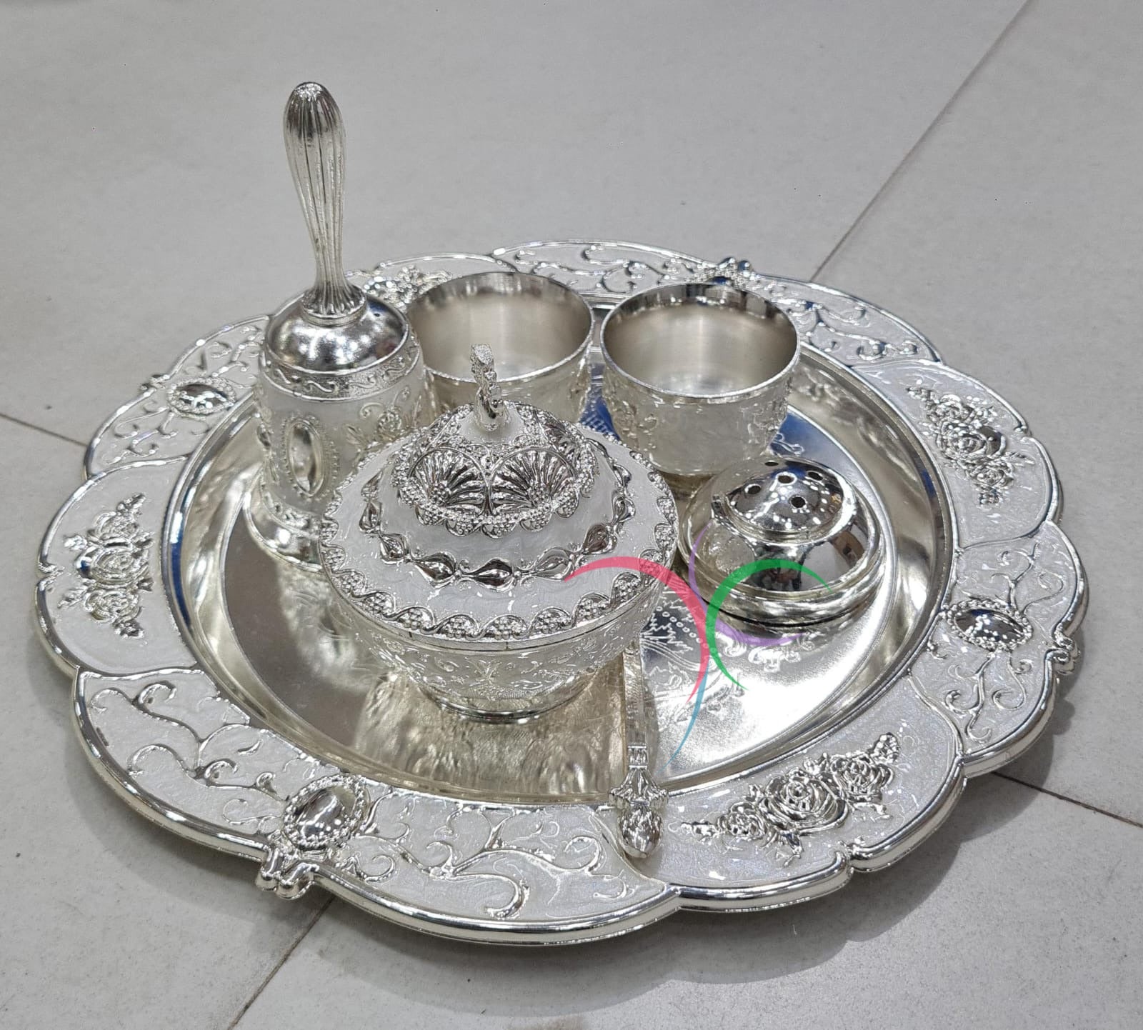 Exclusive collection for festive season Puja Celebrations White Enamel German Silver Pooja Set (14 inch )-USS001WEB