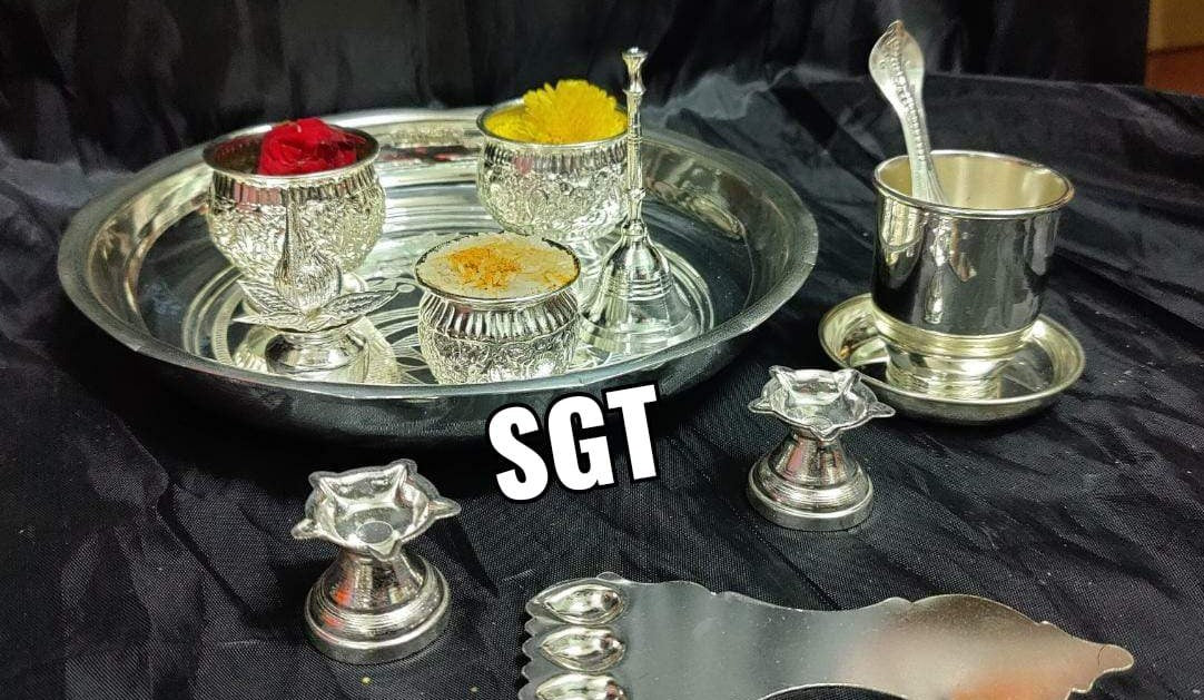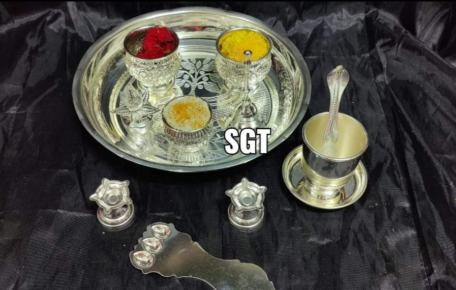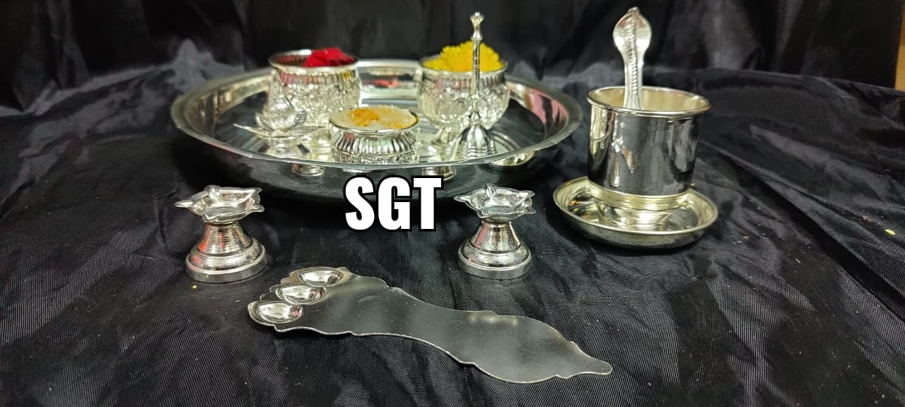 GERMAN SILVER POOJA THALI WITH HARTHI ,KUMKUM BOWLS AND BELL-SNALS001B