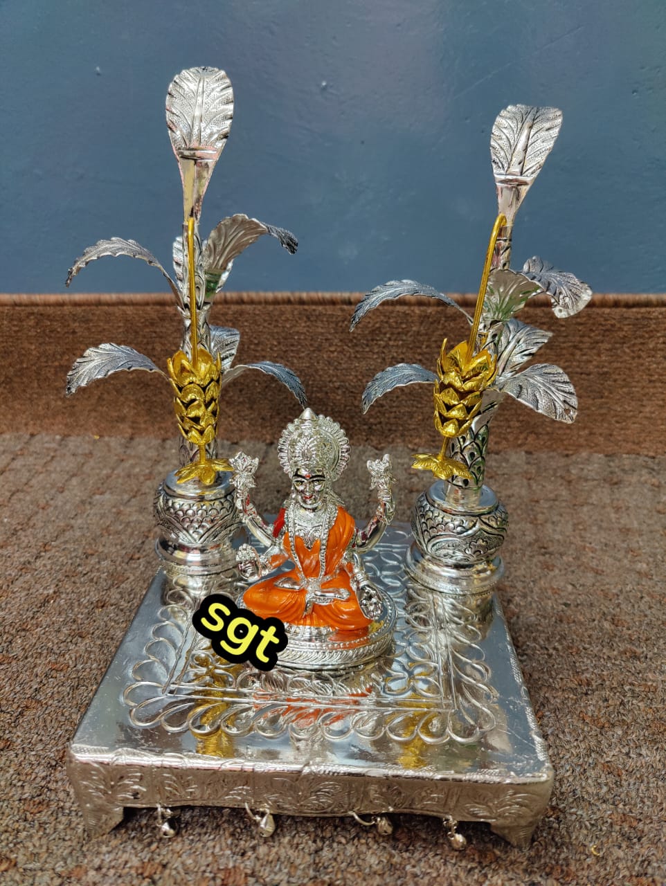 Pure silver and gold coated idol with metallic silver polished chowki with antique German silver washable banana tree pair with gold plated banana stem
