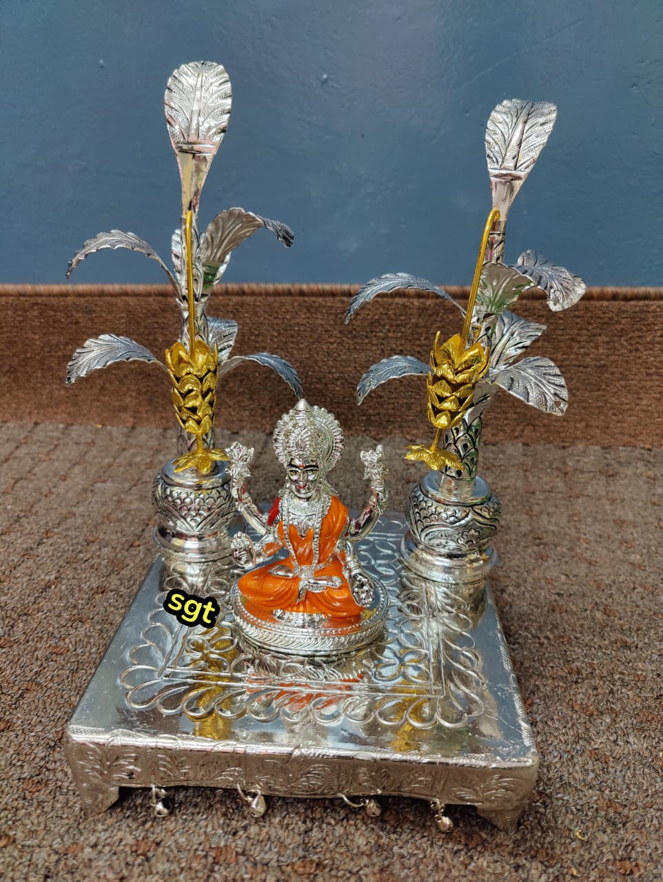 Vyjayanty , elegant Orange Color Lakshmi idol with chowki and banana trees combo for Puja-SILVI001BTCO