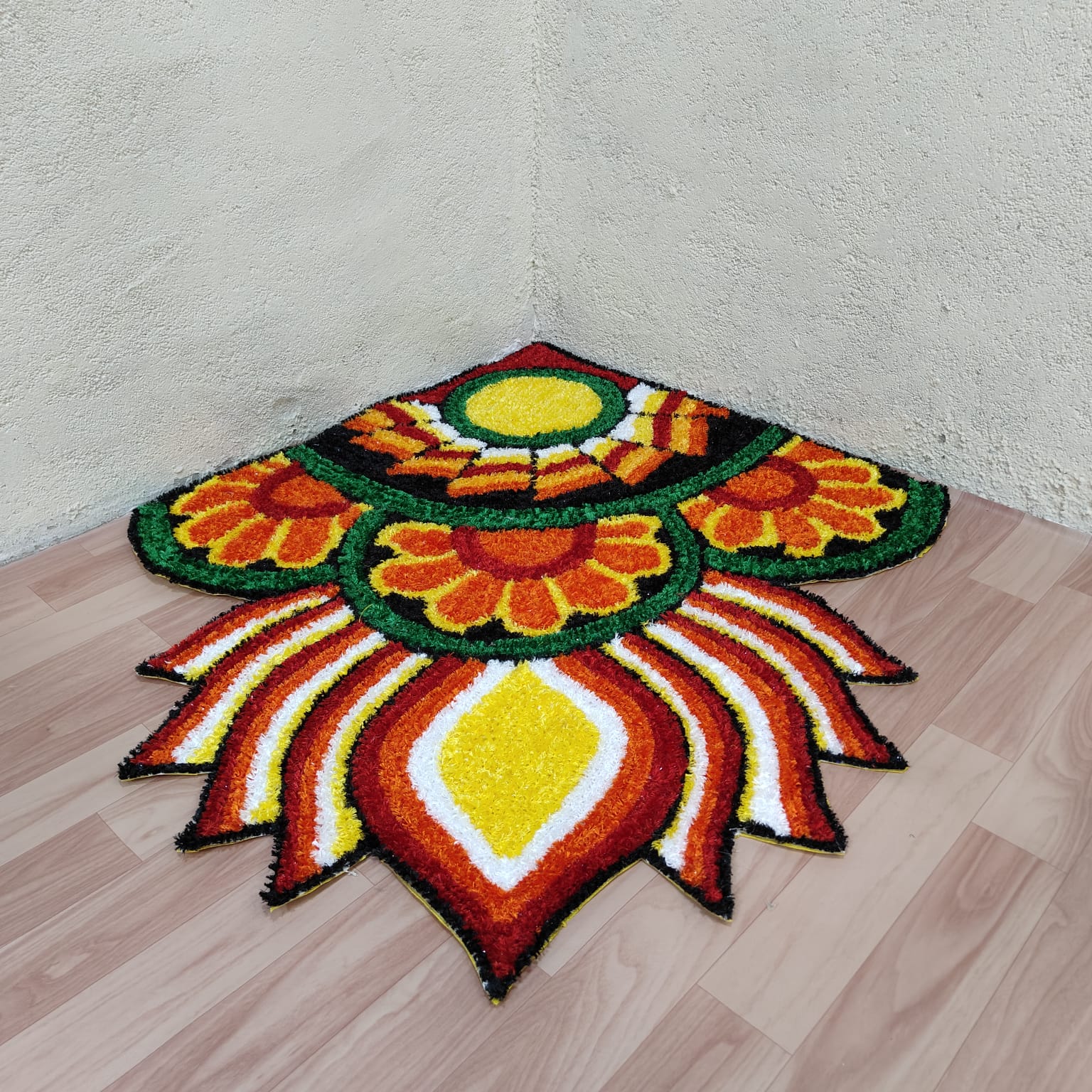 Introducing our new Feather Rangoli(CORNER) mat made with high-quality fur yarn and featuring various beautiful designs. Enhance the beauty of your home, temple, or event with these colorful mats. Available in 3-foot size. Perfect for festivals and special occasions.