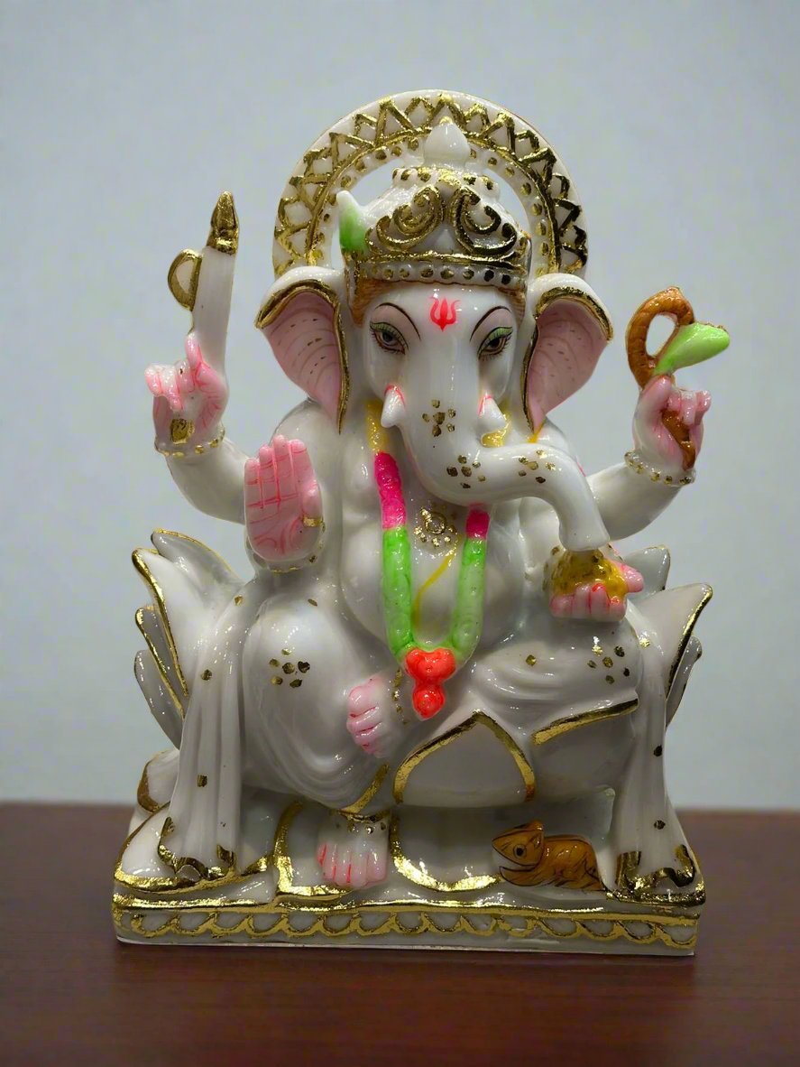 This beautifully carved marble statue of Lord Ganesha features an intricate pagdi design, adding a unique touch to your home decor. Made of high-quality marble, this statue is a symbol of prosperity and auspiciousness, making it a perfect addition to your home or office. Get yours today!