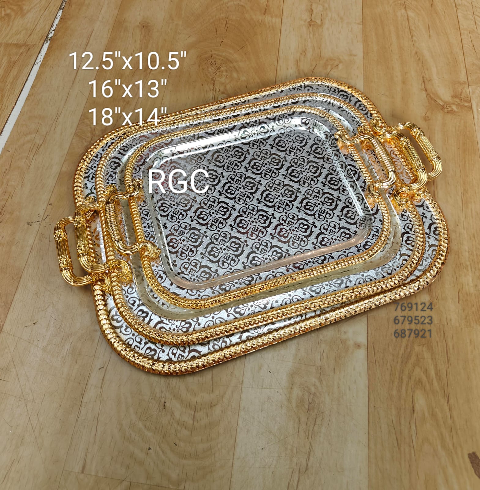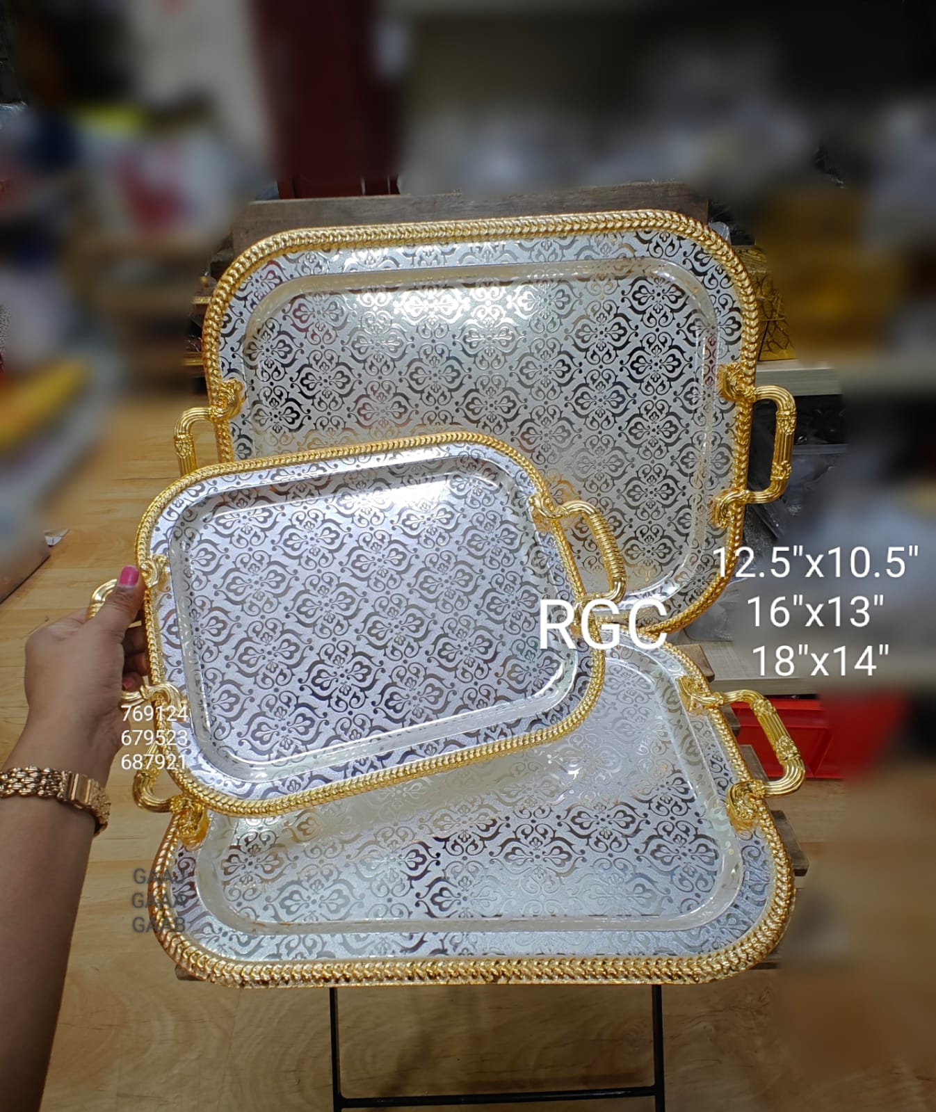 Combo of 3 ,German silver tray with latest etching work and premium silver finish with Golden Handles -AKSH001GTD