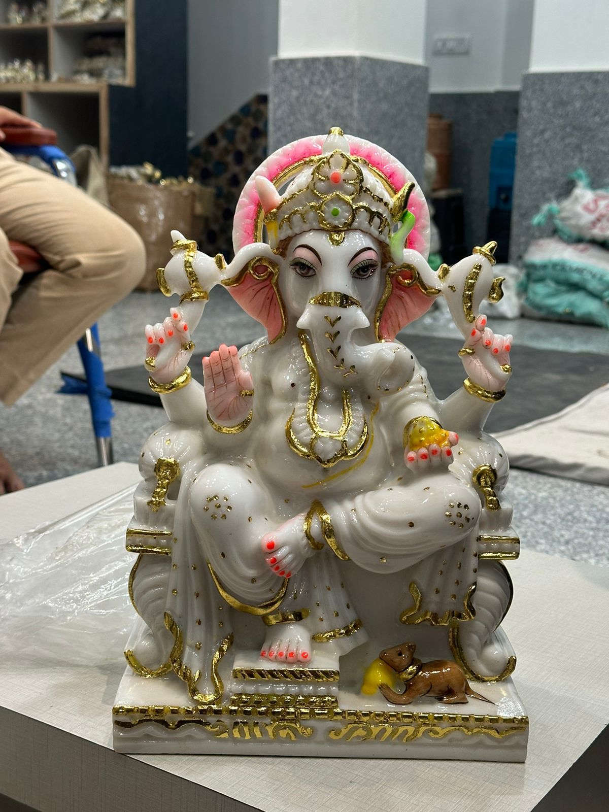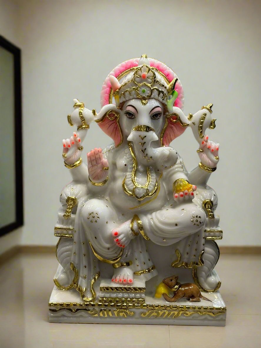 This beautifully carved marble statue of Lord Ganesha features an intricate pagdi design, adding a unique touch to your home decor. Made of high-quality marble, this statue is a symbol of prosperity and auspiciousness, making it a perfect addition to your home or office. Get yours today!