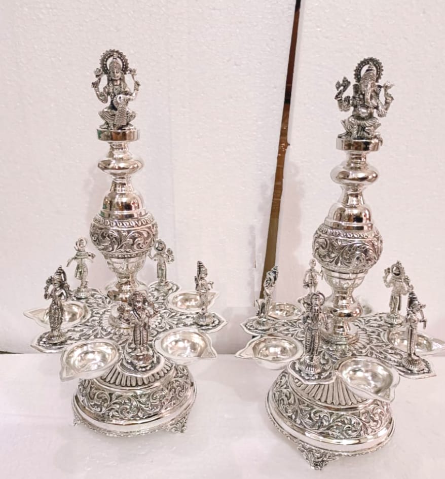 Dasavthar idols with panchadiya with ganesh and lakshmi poles diya with stands