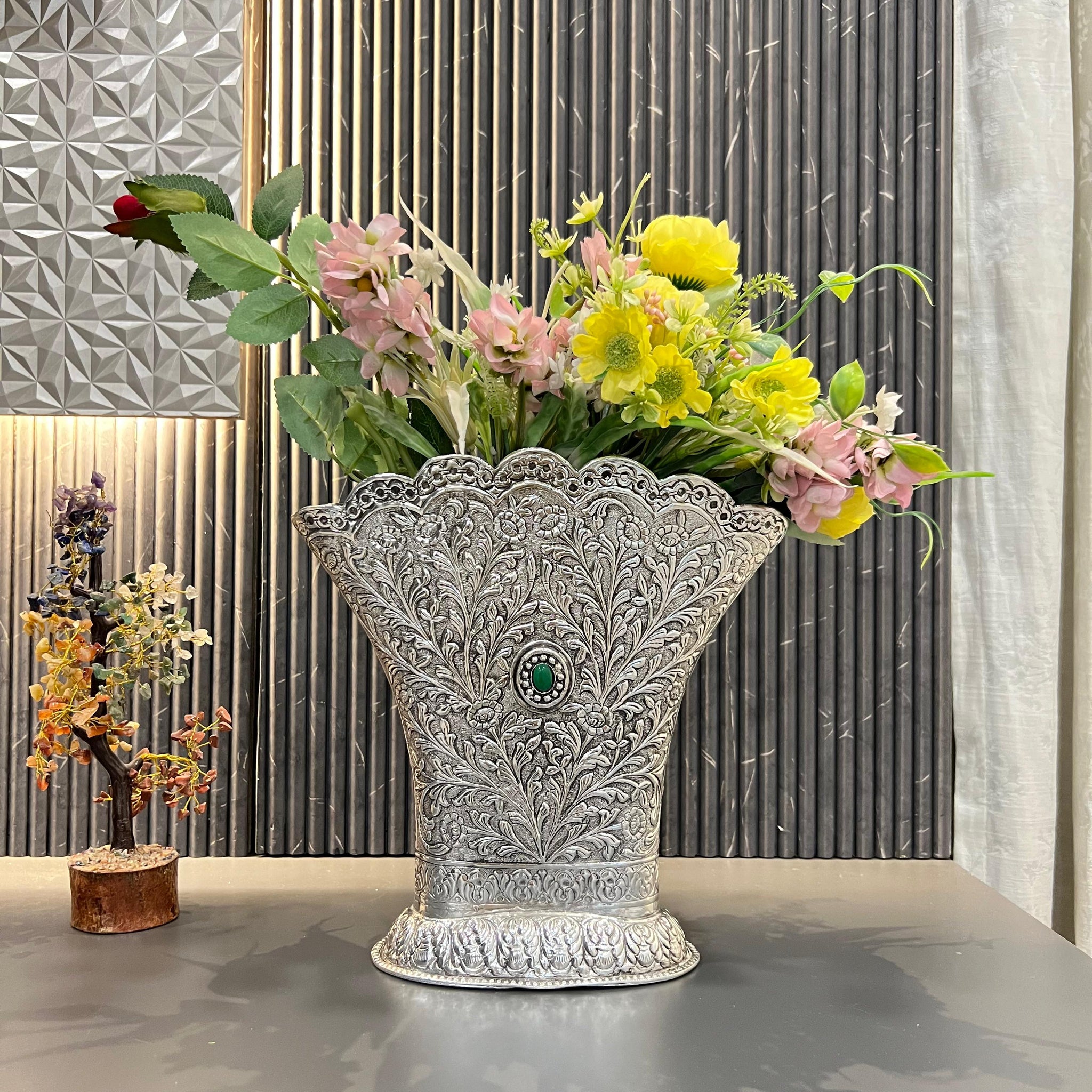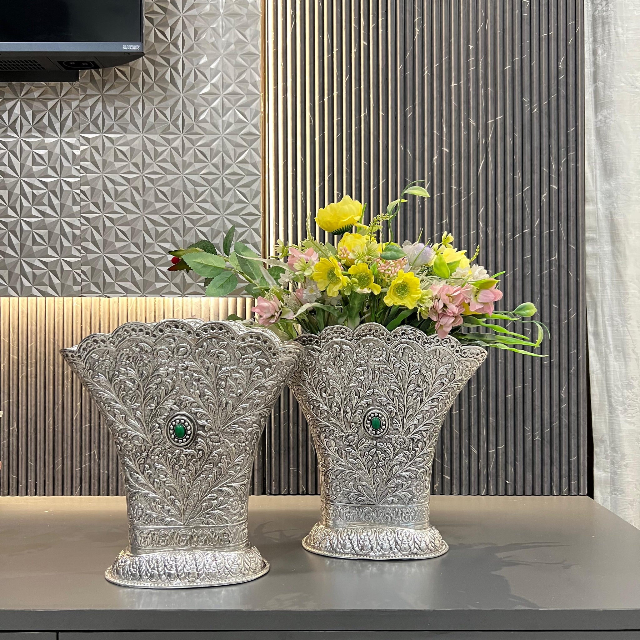 Set of 2 , Exclusive German Silver Hand Engraved Flower Vase for Decorating Your Puja Room This Janmashtami 2025-AKSH001FV