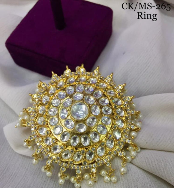SURUMI, ELEGANT KUNDAN STONES AND PEARL DANGLING STATEMENT RING FOR WOMEN-MOEKSR001