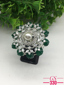 Platinum Finish Jade  Green and White American Diamond Stones and Pearl  studded Statement Ring for Women
