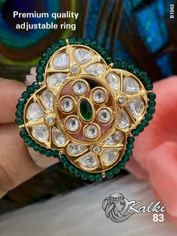 Mrinalini , elegant Gold Finish Statement Green Kundan Finger Ring for women -JAYDU001FR