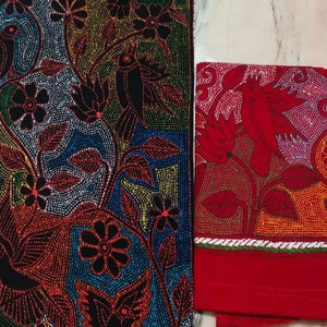 Fine Hand Crafted Kanta Stitches of parrots on Black Cotton Material, Red Contrast Bottom Material with Kanta Work and Red Fine Cotton Material with Kanta Stitches for Dupatta.