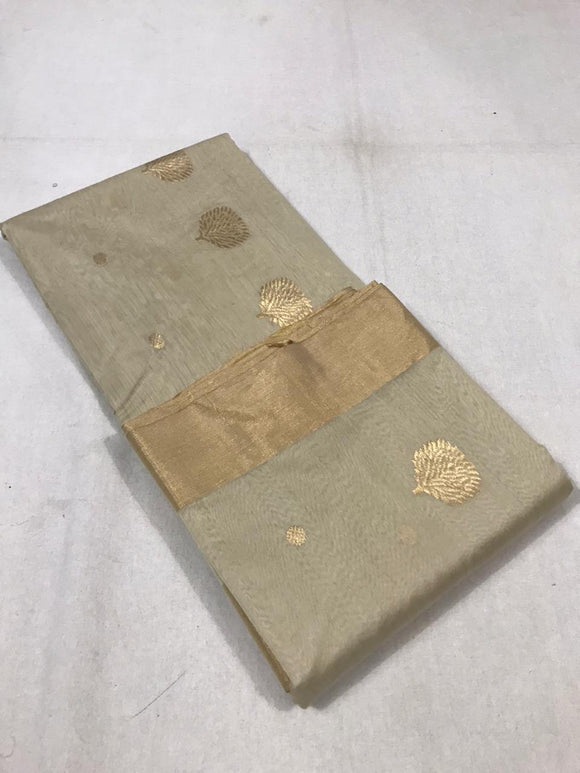 RAJ GARANA CREAM COLOR ORIGINAL AUTHENTIC CHANDERI SILK COTTON SAREE WITH GOLD ZARI AND BUTTIES-OACSS-001