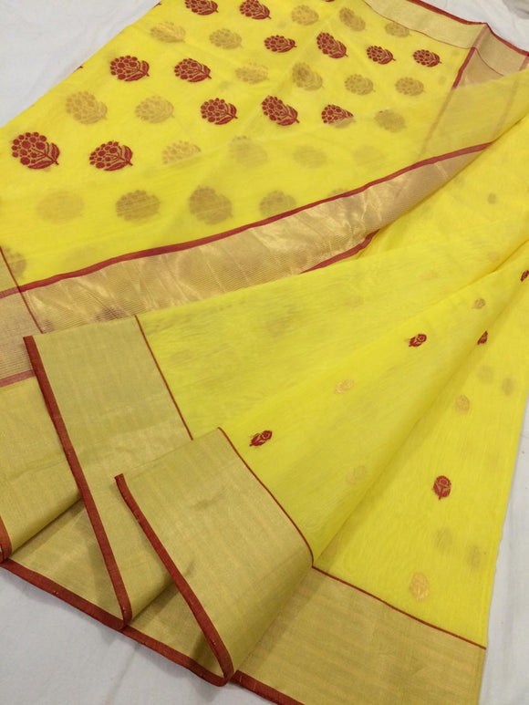 YELLOW CHANDERI SILK COTTON SAREE WITH RED FLOWER DESIGNS AND RED PIPING-SACSCS001