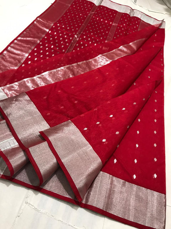 RED AND SILVER CHANDERI SILK AND COTTON SAREE FOR WOMEN -SACSCSW001