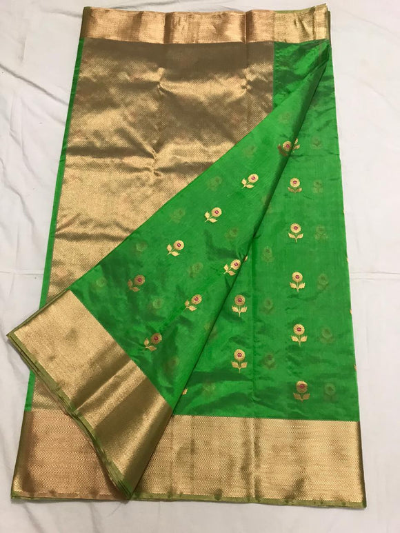 GREEN ORIGINAL AUTHENTIC CHANDERI SILK SAREE WITH GREEN GOLDEN ZARI FOR WOMEN -CSSWG001