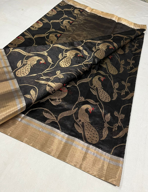 PARINEETA, DESIGNER BLACK SILK SAREE WITH PEACOCK AND PARROT WEAVED DESIGNS-SAPSS001P