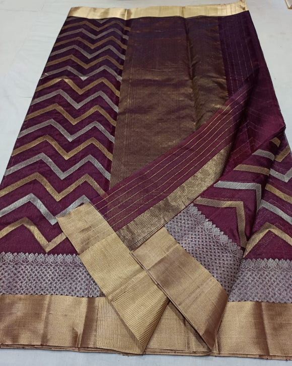 AUTHENTIC CHANDERI SILK SAREE IN MAROON SHADE WITH GOLD AND SILVER ZIGZAG PATTERN DESIGN -SA001MZ