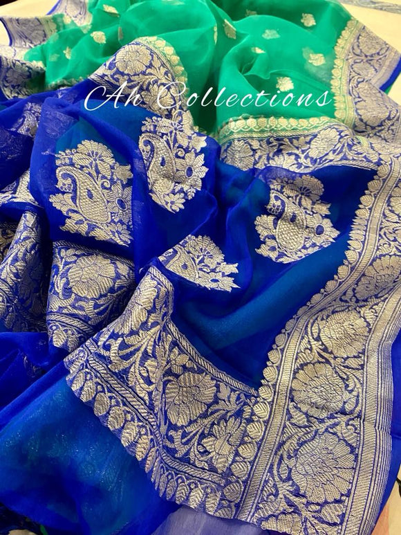 GREEN AND BLUE COMBINATION HANDWOVEN BANARASI PURE CHIFFON SAREE-PDSBCSW001