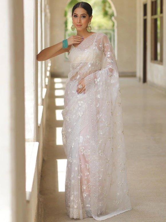 Susanna, Christmas Special White shade Point Embroidered Organza Saree with Blouse Piece-KIA001WSO