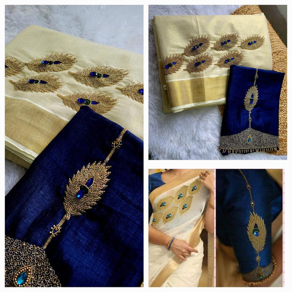 Mayuri , Onam Festival Special Kerala Cotton saree with heavy Handwork on chest Pallu & bp with work on both sleeves-SAHE001CS