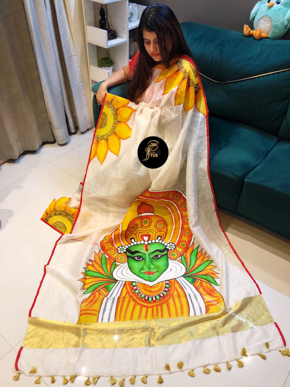 Beautiful Kathakali Hand Painted on Pure handle 100 count organic Linen saree -SRI001KS