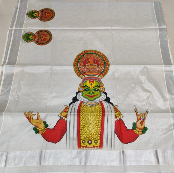 Kathakali , Silver Tissue Sarees With Big Mural Prints On The Pallu And Small Murals Along The Borders-CFSMS001