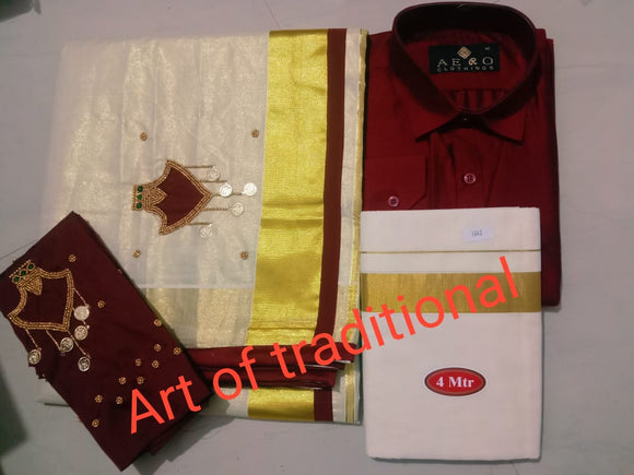 Golden tissue saree palakka design with coin work with blouse and Mens Dress Combo-SAHE001DC