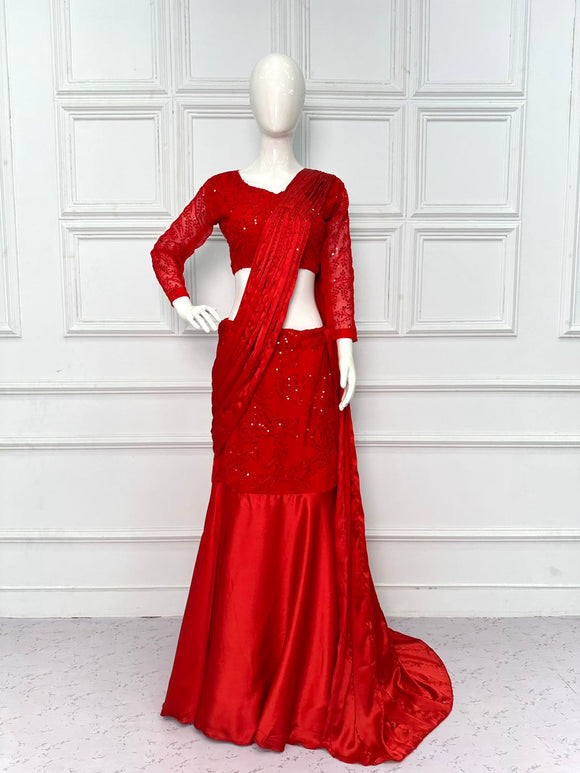 Designer Red Lehenga Saree With embroidered Dupatta and Stitched Blouse-PARUL001LS
