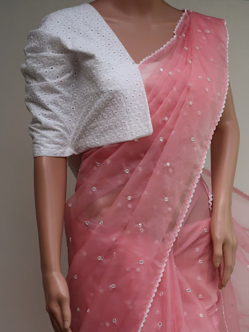 Pink Embroidered Organza saree with scallop lace border and Hakkoba Blouse Piece-KIA001OZP