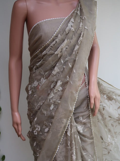 Grey Embroidered Organza Saree with Plain Blouse Piece -KIA001OZG
