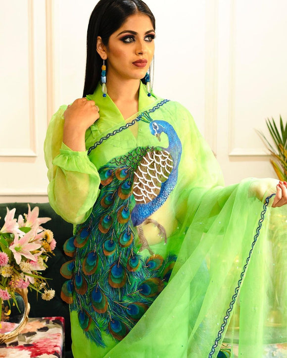 Soft organza saree with Peocock print all over come with handcrafted work and matching silk blouse-AMAZ001PO