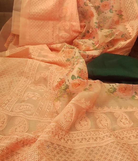 Pink Roses , Chikankari Embroidered Digital Printed Organza Saree with Blouse Piece-KIAA001OSP