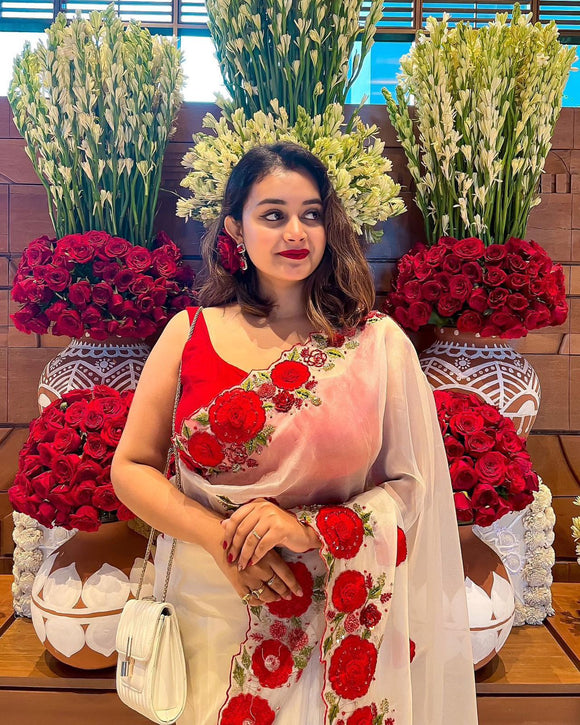 Rose Beauty , Pure White Organza Red flower heavy embroidered Saree for Women-AMAZE001WOS